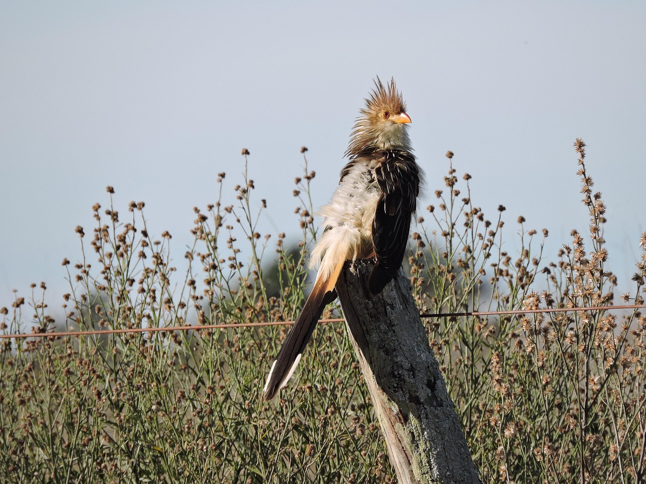 In the open savannas and scrublands of South America, you might see a bird that looks like it just rolled out of bed after a very rough night. With a wild, spiky orange crest, a scruffy, streaked body, and a long, messy tail, the Guira Cuckoo (Guira guira) is the undisputed “punk rocker” of the bird world.