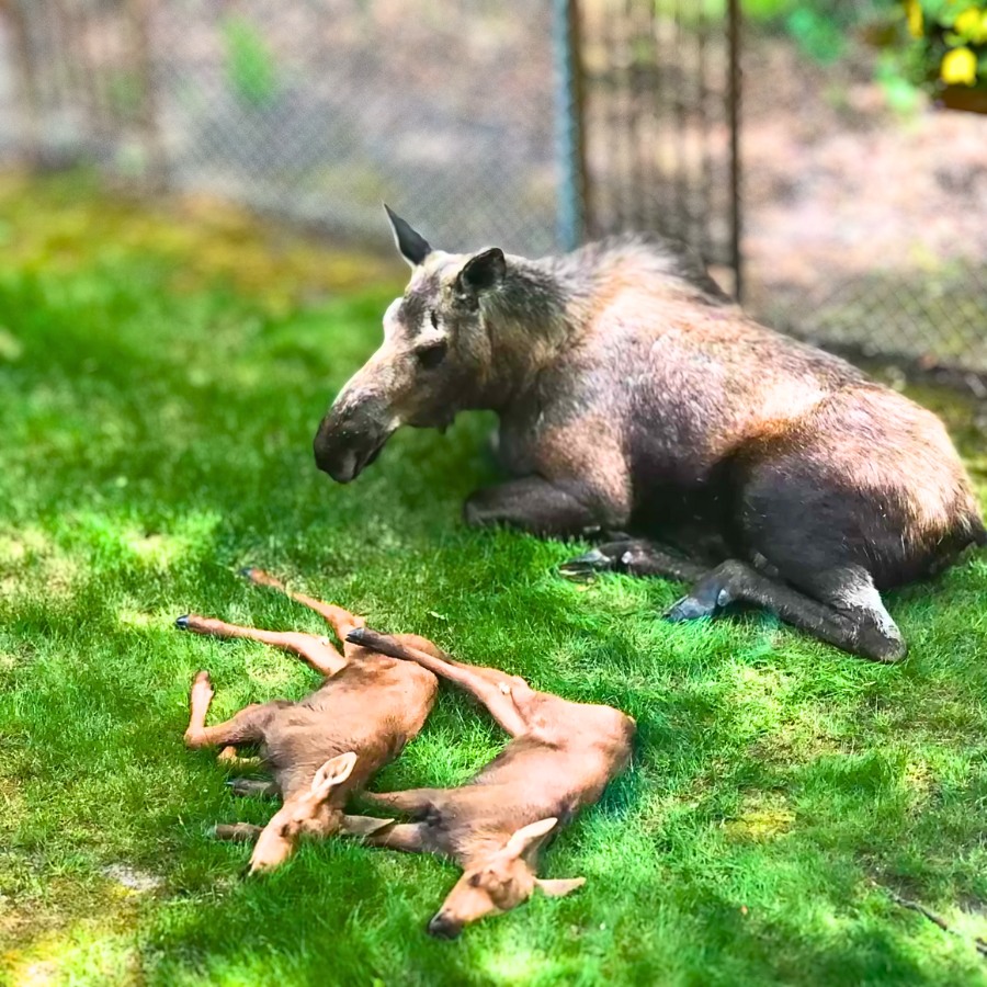 The mother moose lay down in the grass, her calves curled up beside her. Their legs, still wobbly with youth, stretched out as they shifted to follow the moving sun.