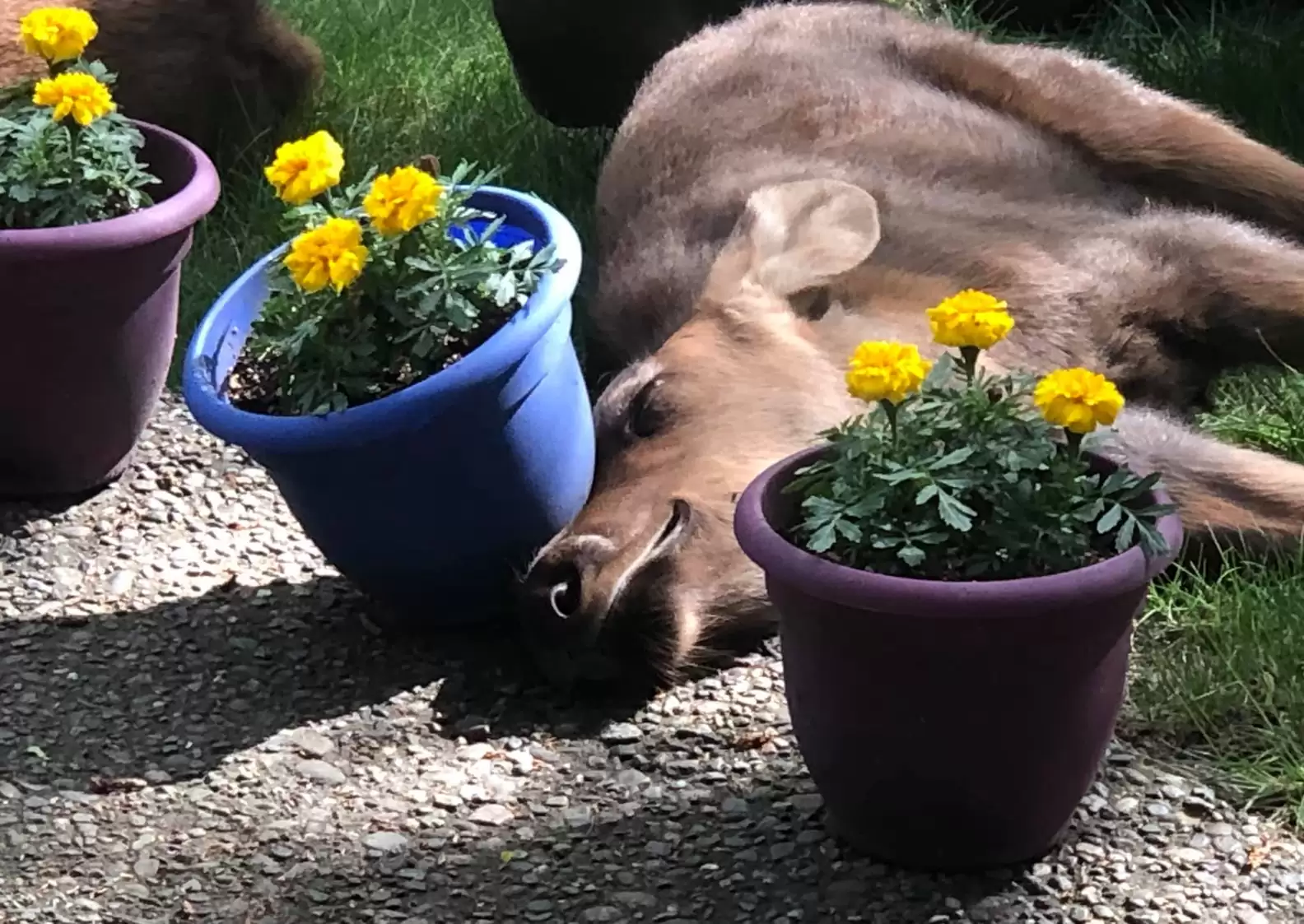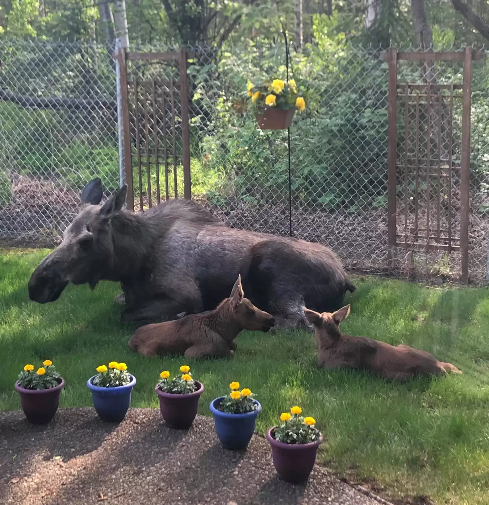 As hours passed, the moose family made themselves completely at home. The calves explored the flowers, sniffed at the fence, and even caused a little chaos.