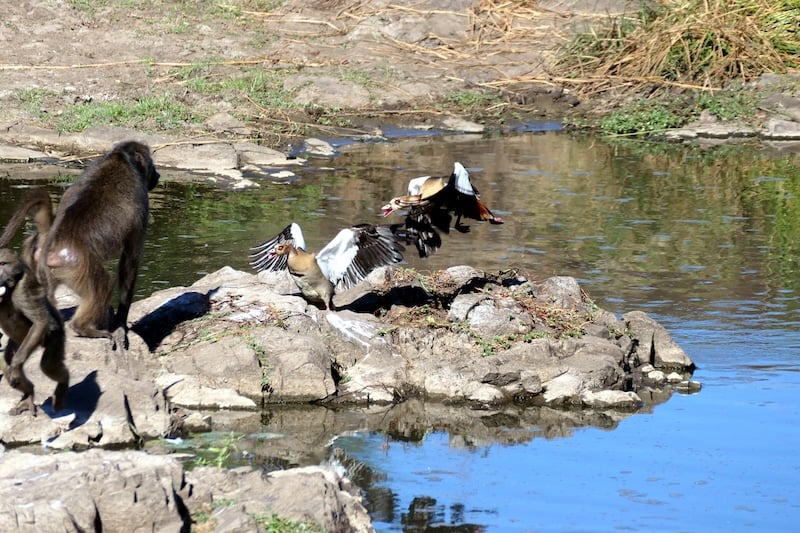 The scene began quietly, with geese guarding their nest near Sweni Hide. But their calm was short-lived. A troop of baboons approached the area, acting disinterested—until, in a flash, one baboon lunged forward and snatched the eggs. The geese, startled and protective, began honking and flapping their wings in protest.