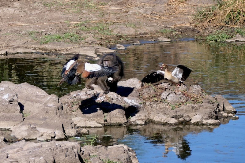 What the birds didn’t realize was that this was a coordinated distraction. As they chased the first baboon, another slipped in from the side and stole even more eggs. The baboons retreated quickly, with the mother goose in pursuit—but she was no match for their agility.