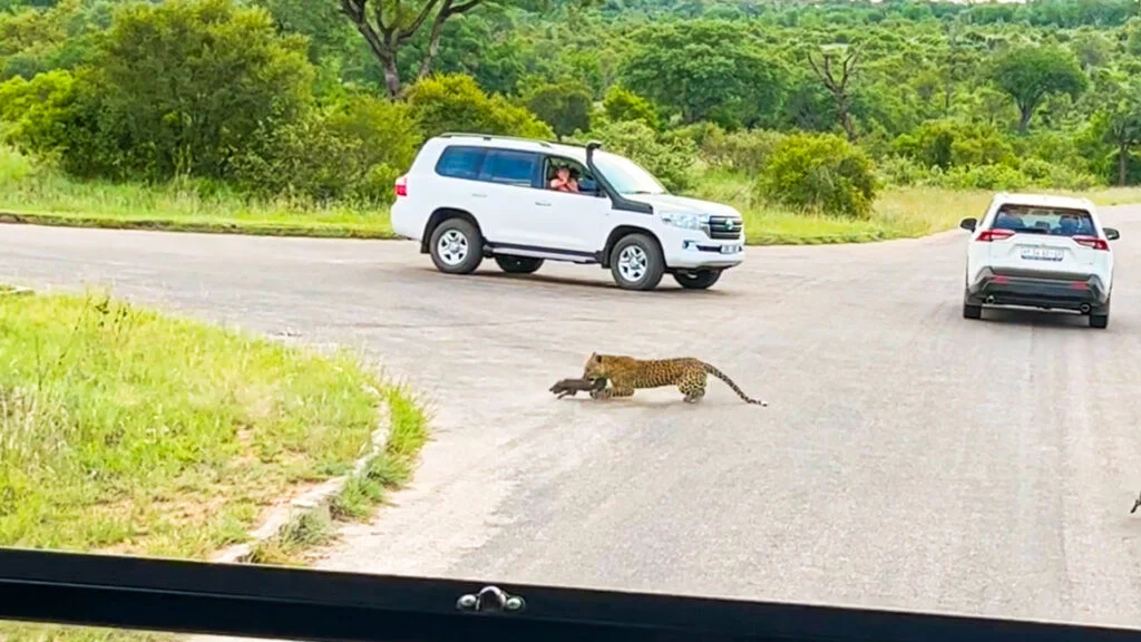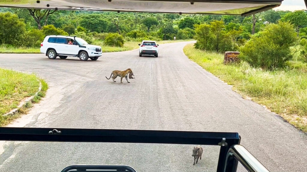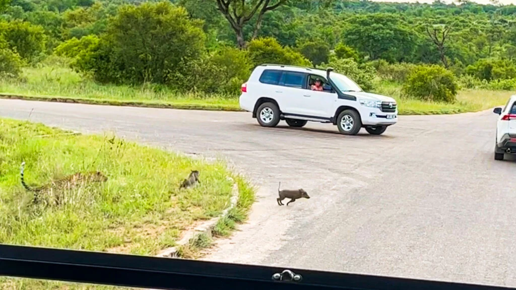 As they drove deeper into the reserve, the group came across a family of warthogs playing on the road. The mood was light — cameras clicked, laughter echoed, and the scene looked peaceful. But the calm was short-lived. Suddenly, one of the guests shouted, “Leopard!” and everything changed.