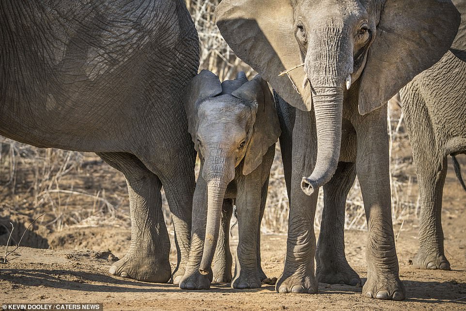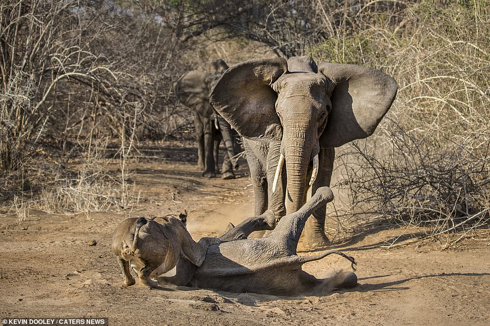 Wildlife photographer Kevin Dooley witnessed the unforgettable event during a recent visit to Mana Pools. The two lionesses had originally been stalking a warthog, planning an easy meal. But the situation changed suddenly when a curious baby elephant — wandering away from its herd — started playfully chasing the warthog.
