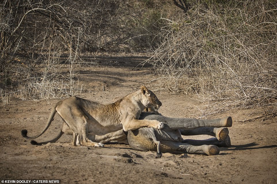 Unaware of the danger lurking nearby, the calf stumbled straight into the path of the predators. Sensing a much larger meal, the lionesses abandoned their original plan and turned their attention to the young elephant.
