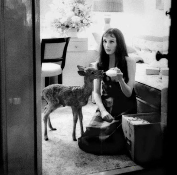 In 1959, Audrey was cast in the film Green Mansions. Her character had a fawn as a companion. The animal trainer suggested she take the baby deer home to bond with it. Most actors would have spent a few hours. Audrey, however, took the fawn into her home, and her heart. She named him Ip, and he became her shadow.