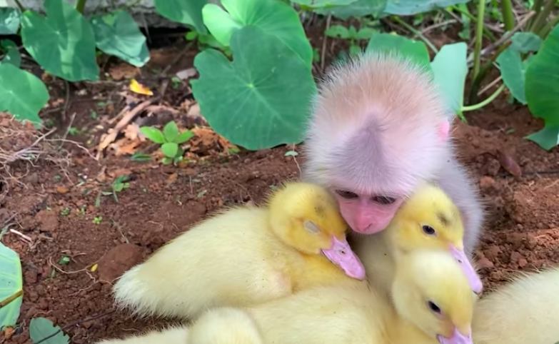 Recently, a baby monkey was caught on camera caring for a group of ducklings—treating them as if they were his own little siblings.