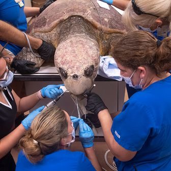 The drama began when a severely injured loggerhead turtle was found near the Port St. Lucie power plant in Florida. Her left front flipper had been recently bitten off in a vicious shark attack. The Florida Fish and Wildlife Conservation Commission rushed her to Zoo Miami’s brand-new Sea Turtle Hospital – in fact, the hospital wasn’t even officially open yet, but they immediately took her in.