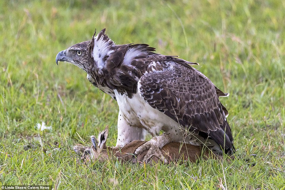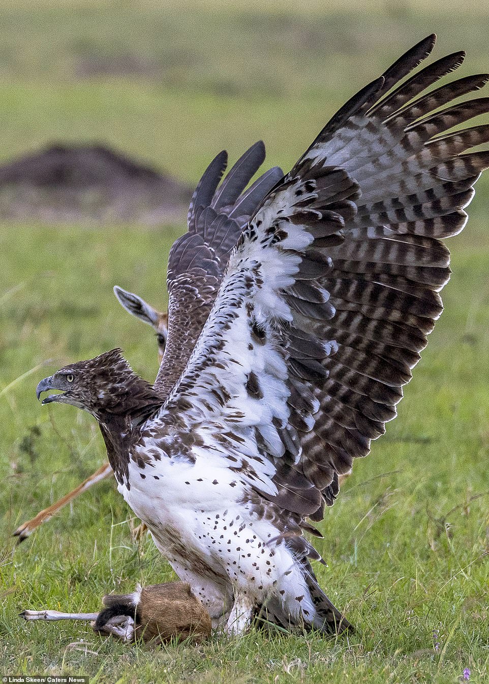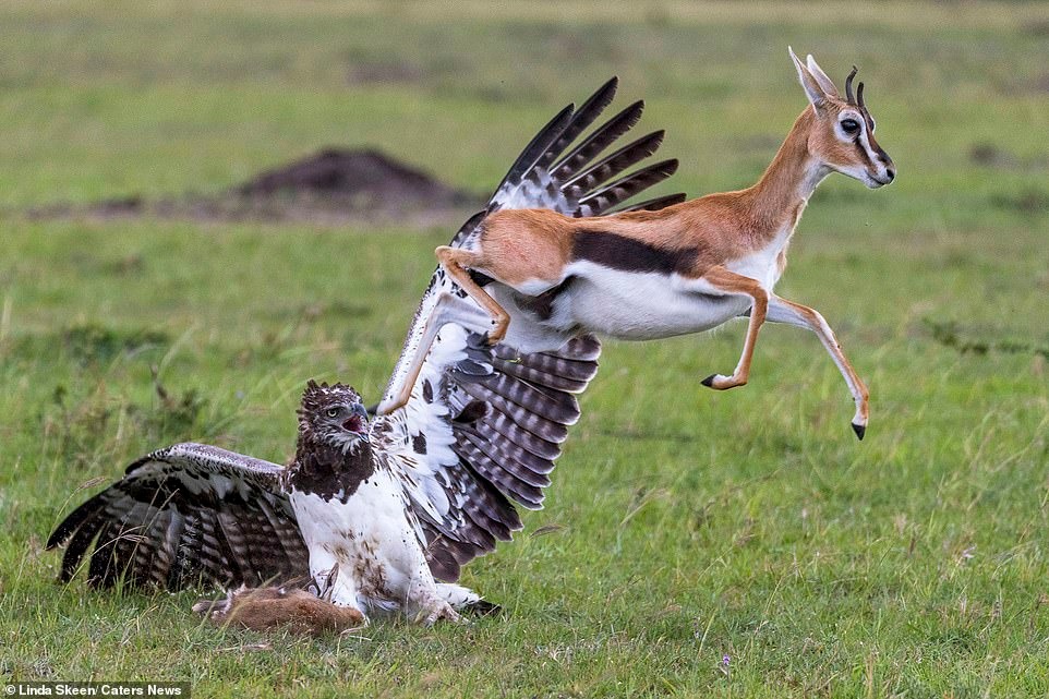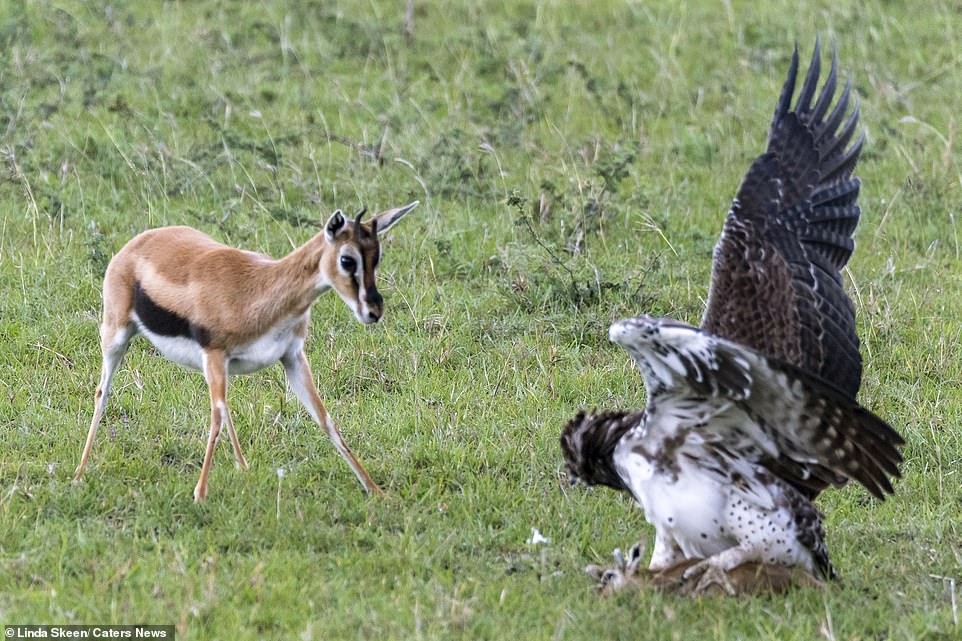 The eagle had targeted a brand-new baby Thompson’s Gazelle, sinking its claws into the tiny creature’s skull and grounding it in a brutal ambush.