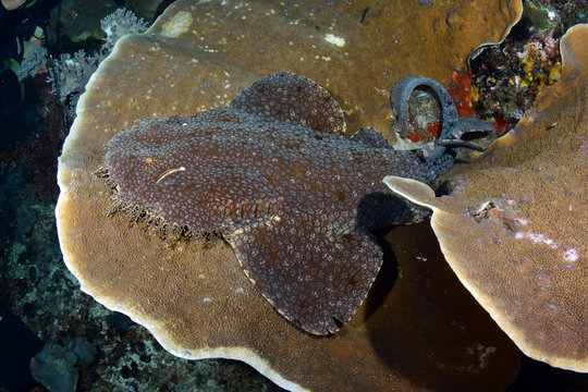 Carpet sharks inhabit the shallow coral reefs off northern Australia, New Guinea, and nearby islands. Their fringed, flattened bodies are covered in branched lobes and complex markings, which allow them to completely vanish against the colorful backdrop of the reef.