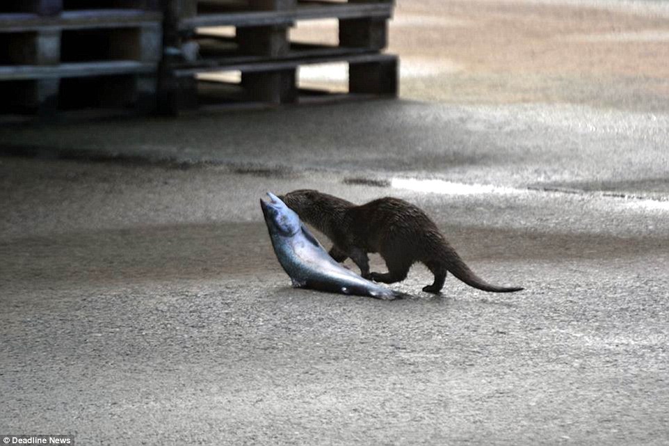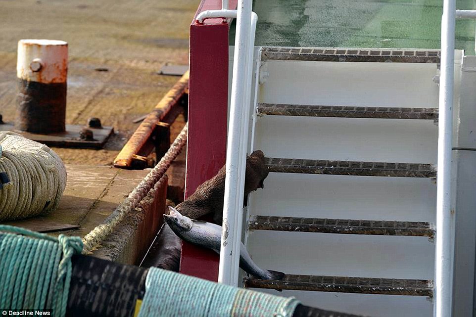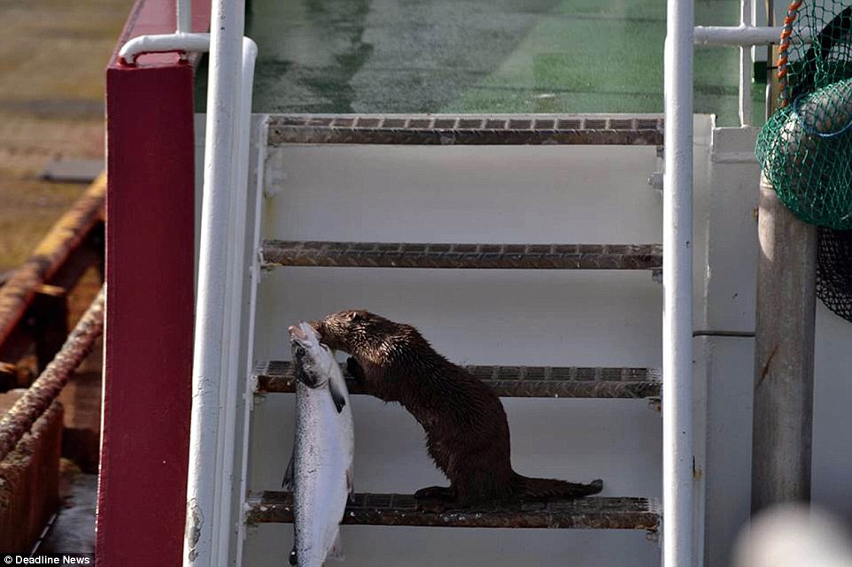 Stills of the otter getaway were also taken by Charlie Umphray AN amazing video shows the moment a brazen otter steals and struggles off with a 10lb salmon from a boat. The crafty creature manages to drag the fish up a steep flight of steps and then on to a pier before scarpering for safety. The remarkable footage was filmed by skipper David Lowe in Lerwick, Shetland. The salmon is at least as long as the otter - and may weigh more - but that doesnít deter the otter. Several times he can be seen almost dropping the fish into the water below and at one point he slips down the side of the stairway.