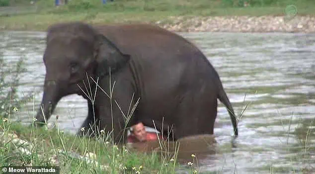 Video footage captured the incredible scene. Kham Lha pushed against the current, her little legs churning, her trunk held high like a snorkel. Her only focus was reaching Darrick. When she got to him, she used her trunk to try and nudge him towards the bank, even attempting to shield him with her body and lift him with her leg. It was a pure, instinctive act of protection.