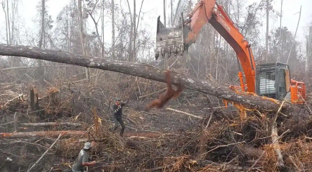 The video shows a massive excavator tearing through the forest with mechanical indifference. Ancient trees, home to generations of orangutans, fall like matchsticks. Then, amidst the destruction, a lone orangutan appears, clinging to the wreckage of its world.