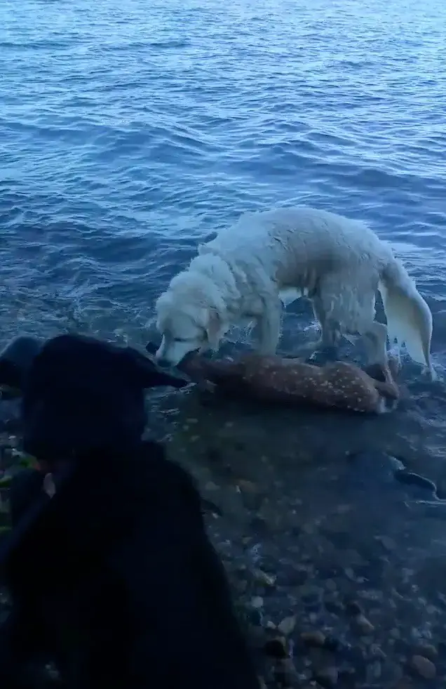 Without waiting for a command, Storm plunged into the sea. His owner watched as Storm paddled straight for the fawn, gently grabbed it in his mouth, and doggy-paddled back toward shore. The fawn was exhausted and weak, collapsing onto the beach, shivering and stunned.