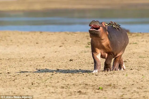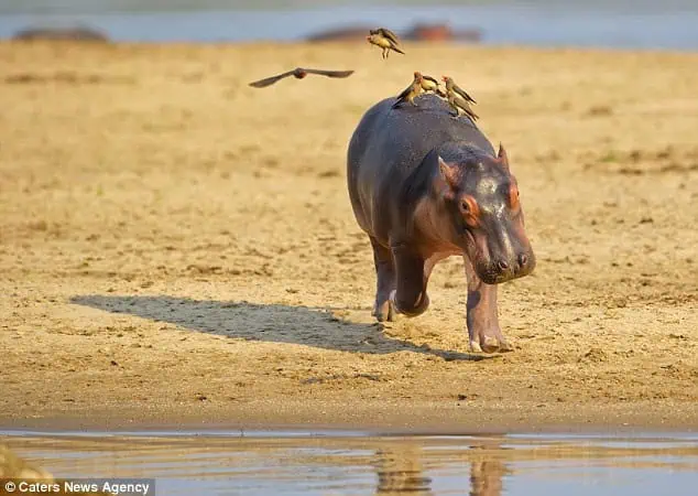 In the wild, this is a classic symbiotic relationship. The oxpeckers eat ticks and parasites off the hippo’s thick skin, getting a free meal while the hippo gets a free cleaning service. Adult hippos know this and barely notice. But this Baby Hippo vs. Birds scenario was different. The calf had no idea these birds were friends. To him, they were invaders.
