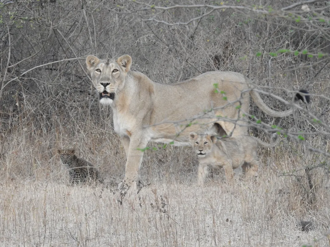 Over a 45-day observation period, researchers spotted the leopard cub with the lioness and her family 29 times.