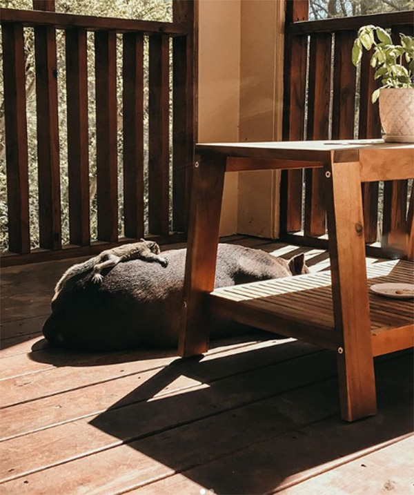 Instead of chasing him off, Everly just sat down and let the little guy get close. Closer. Then, as if it was the most normal thing in the world, the squirrel curled up right on top of her and passed out.