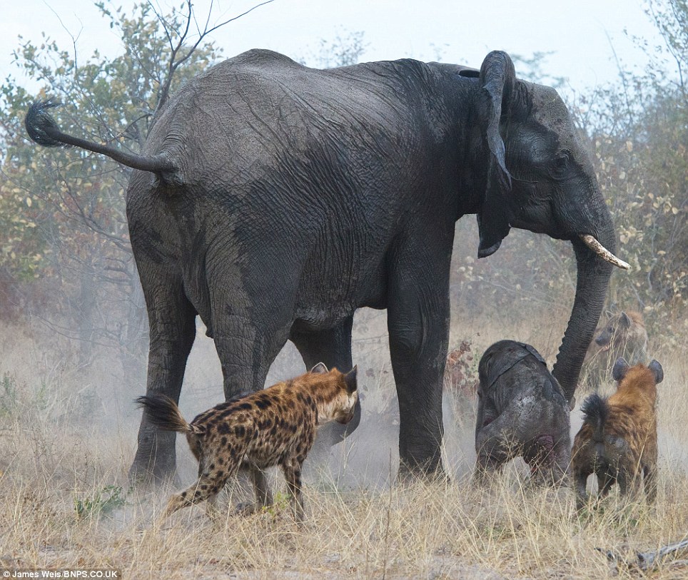 The elephant swung her massive trunk, kicked out with her feet, and sent dust flying in all directions. One hyena was hurled aside, another buried its face in dirt as it tried to flee.