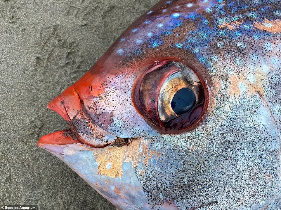 The opah, measuring over 3.5 feet (1 meter) long, was discovered early in the morning by a passerby who quickly alerted staff at the Seaside Aquarium in northern Oregon. When marine experts arrived, they found the fish in near-perfect condition — its scales still shimmering in shades of silver and red.