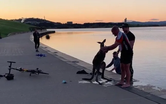 But the men stayed calm. They managed to grasp its arms gently, guiding the kangaroo toward the shore.