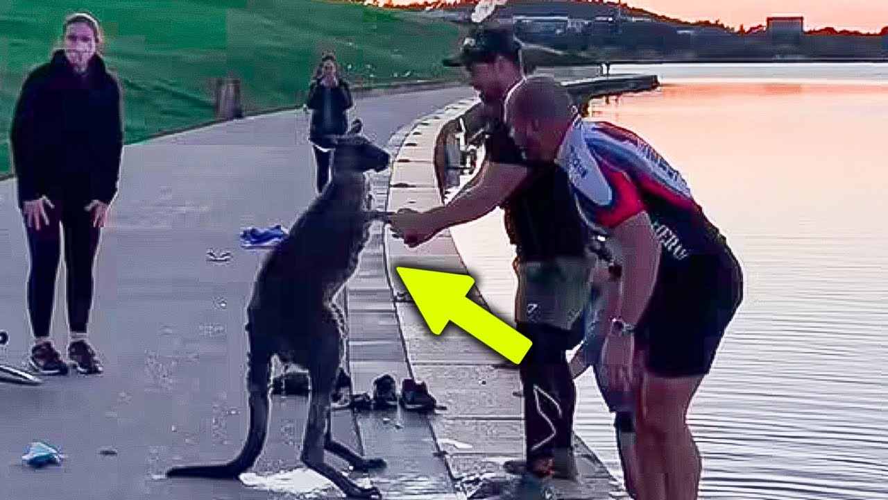 In a moment that had onlookers stunned, the roo reached out one paw — holding it up to one of the men, as if offering a handshake.