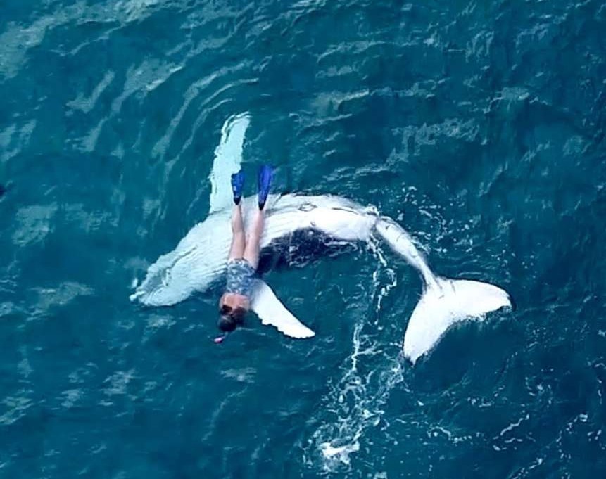 For a few surreal seconds, diver and whale floated together—stomach pressed against stomach—weightless in the blue. The drone above caught every second: awe, nerves, joy, and the sheer scale of the animal.