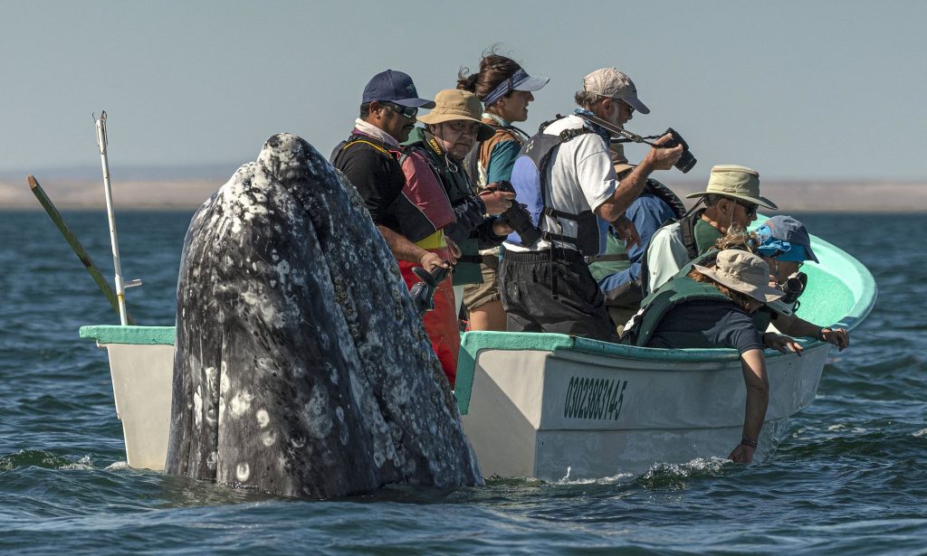 The tourists had been watching the calm surface of the San Ignacio Lagoon, hoping to see movement in the distance. What they didn’t realize was that their dream sighting was already happening right behind them.