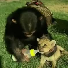 Then, in a moment of pure compassion, the chimpanzee picks up a small milk bottle and carefully begins to feed the cub, as naturally as a mother would her own child. There is no fear, no hesitation—only an overwhelming sense of nurture.