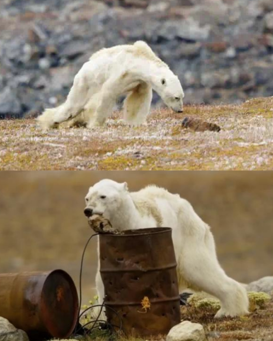 His team filmed, their eyes filled with tears. The bear moved with agonizing slowness, its body ravaged by a long, slow starvation. Every step was a painful effort. It stumbled over to a rusty garbage bin left by local fishermen, its instincts still screaming for food. It pawed weakly at the can, finding nothing. It was a devastating moment: a powerful apex predator, reduced to a desperate scavenger, dying a slow death on land because the ice it depended on was gone.