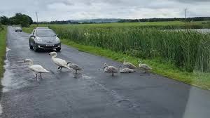Instead of trying to shoo them or call for help, Jos tried something remarkably gentle. He started walking slowly towards the road, looking back to see if the swans might understand his intention. To his absolute amazement, they did! The entire family – father, mother, and all seven cygnets – lined up neatly behind him, forming a perfect single file.