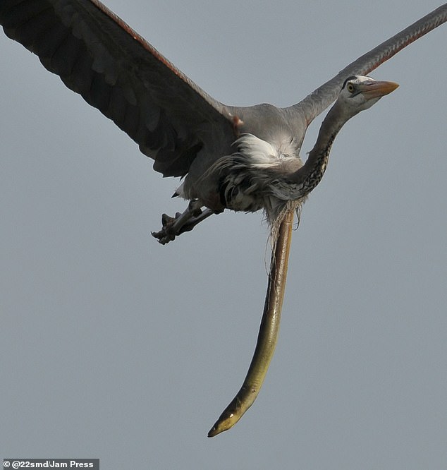 For a moment, it seemed like any other hunting scene. The heron tossed the eel in the air and gulped it down, preparing to take off for a quiet perch to digest its breakfast.
