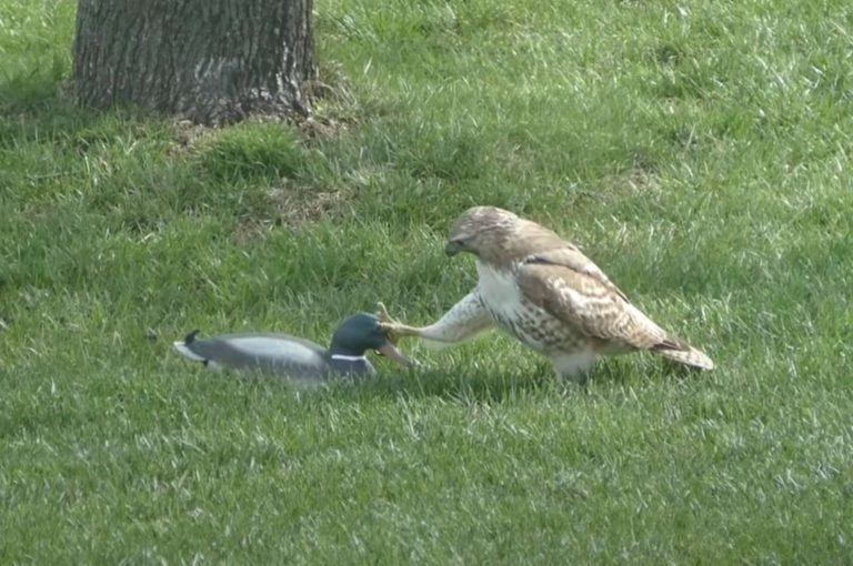 Persisting, the hawk peered from all angles, tested its talons, pressed on the duck’s surface as if trying to elicit a reaction. But no matter how much it tried, nothing changed. Finally, the hawk gave up and flew away — apparently defeated by its own confusion. Behind the scene: the “duck” was a lifelike decoy. (Yes, a fake bird.)