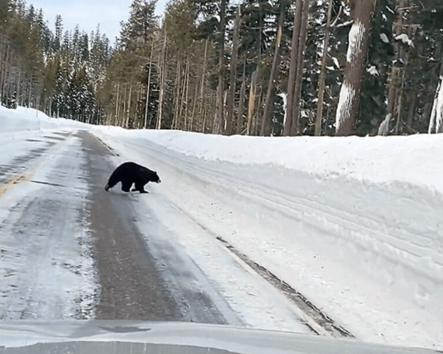 While driving through Crater Lake National Park in southern Oregon, an outdoor tour guide spotted something extraordinary — a lone bear wandering along Highway 62, trapped between towering snowbanks.